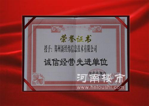 2014年(nián)9月(yuè)6日(rì),在由河(hé)♣♠南(nán)電(diàn)視(shì)台聯合東(dōng)方衛視(shì)等媒體(tǐ)單位共↕§同舉辦的(de)中國(guó)夢之聲 “共創誠信文(wén)明(míng)河(φ&hé)南(nán),推動企業(yè)健康發展”主題晚會(huì)上(shàng),鄭§州新經緯信息技術有限公司榮獲“誠信經營先進單位”榮譽證書(<↔shū)和(hé)獎牌。